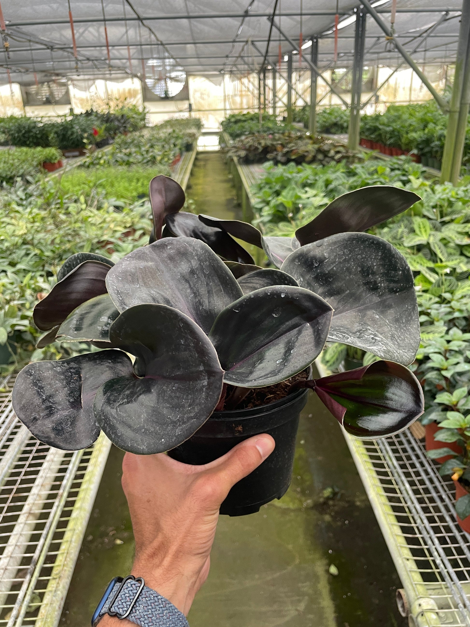 - Description: Geo has unique color and texture. The tops of the leaves are a glossy dark green, whereas the undersides are velvety, dark, and purple-black. Geo’s leaves are thick, making it perfect for an indoor environment. Plants with thicker leaves tend to transpire (lose moisture) more slowly, making them less likely to get brown edges.