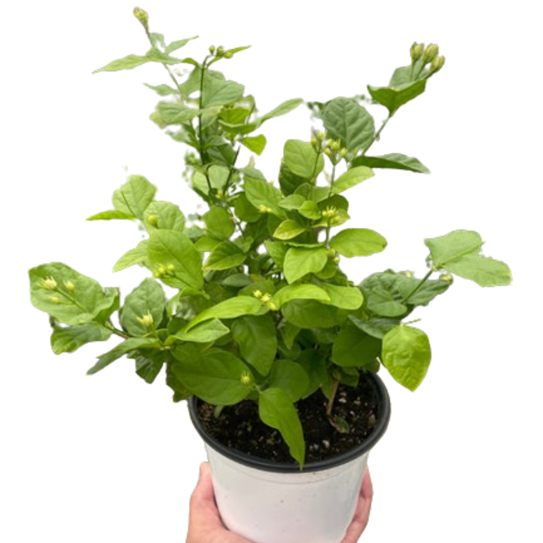 - Description: Jasminum sambac, a tropical evergreen shrub or vine that can grow up to 9.8 ft tall and wide. It has glossy dark green leaves that are arranged in whorls, with opposite pairs of leaves.